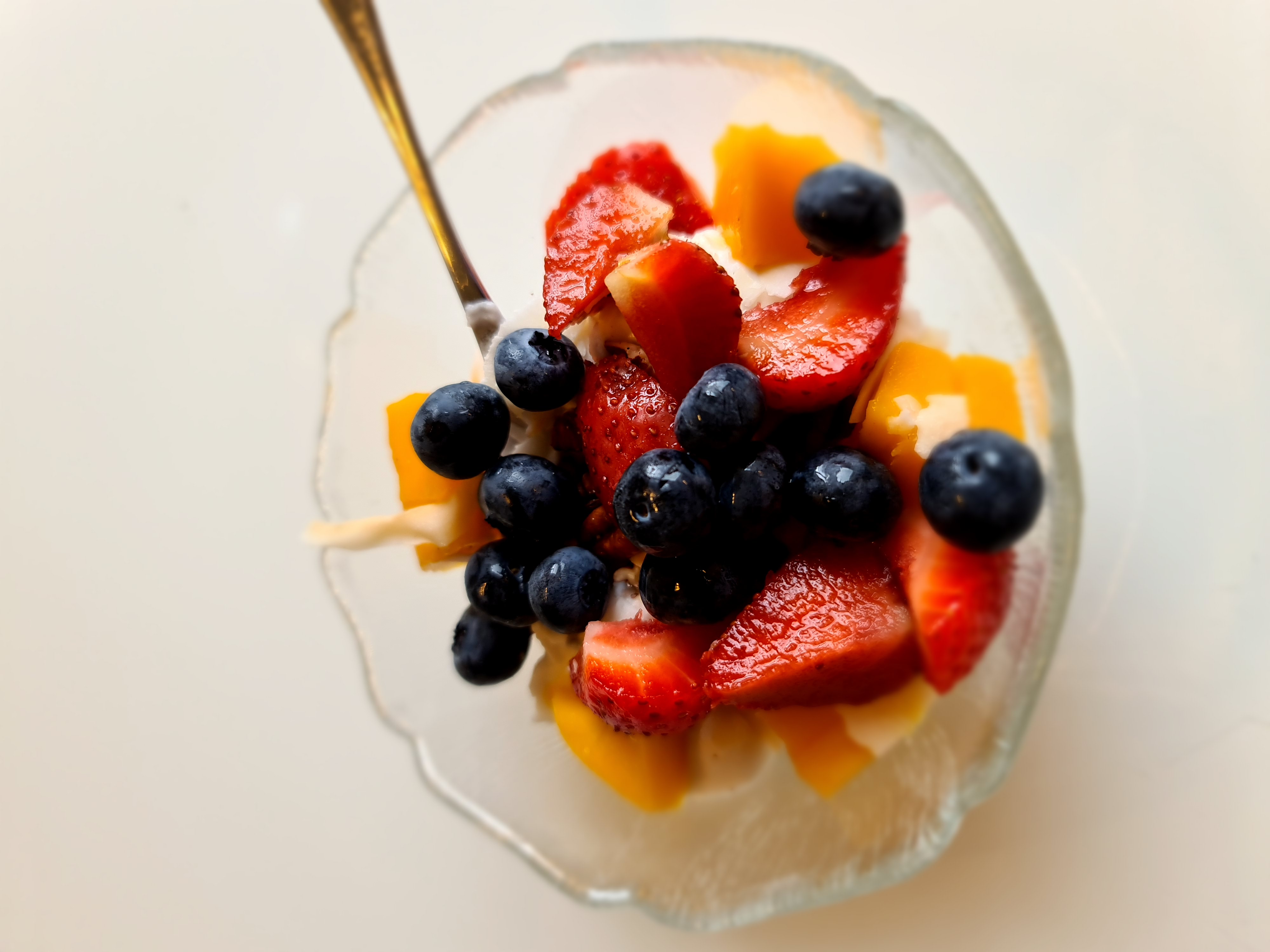 Skeið af möndlusmjöri og toppað með berjum/mangó