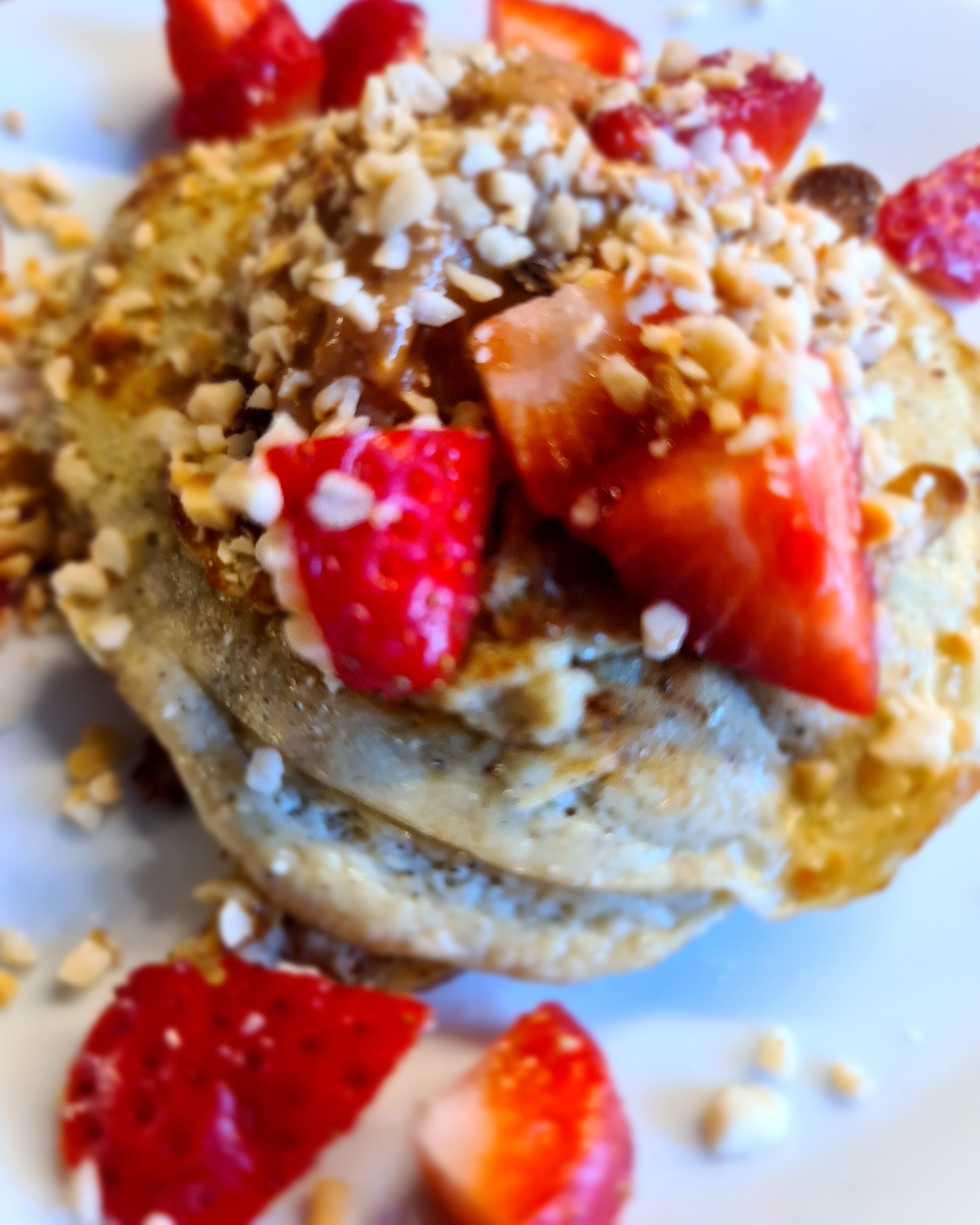 Set blómkál og egg í blandarann og blanda þar til þetta er orðið að pönnukökudeigi. Þú getur kryddað þetta eins og vill. Ég setti salt, pipar og dill bara af því að ég setti það á eggjakökurnar mínar. Mæli með að leika sér með þetta. Búnir til 3 klattar og steikt á pönnu. Sett á disk og toppað með möndlusmjöri, jarðarberjum og hnetukurli (þarna vantaði mig fitu og því valdi ég þetta meðlæti)