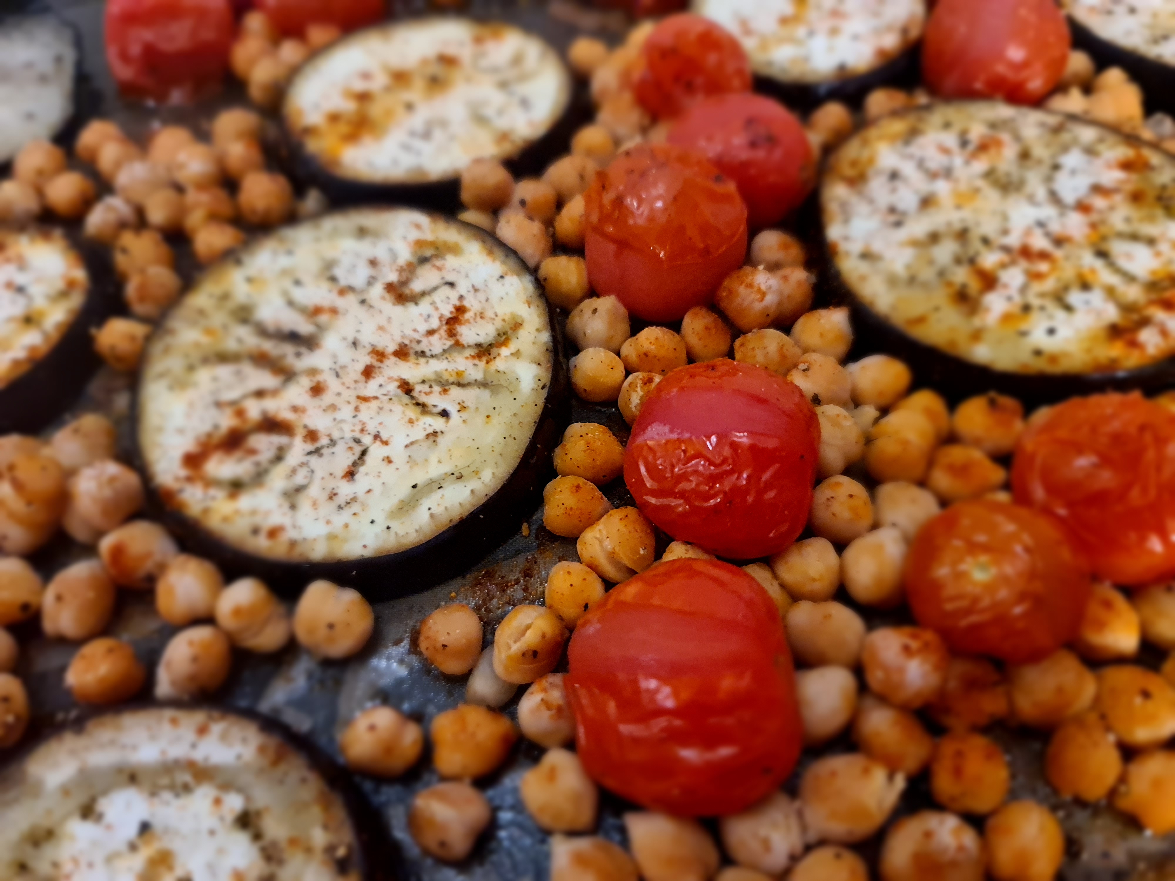 Eggaldin er skorið í sneiðar. Svekkt yfir olíu og kryddað, snúið við á hina hliðina og tómötum og kjúklingabaunum er dreift yfir plötuna.