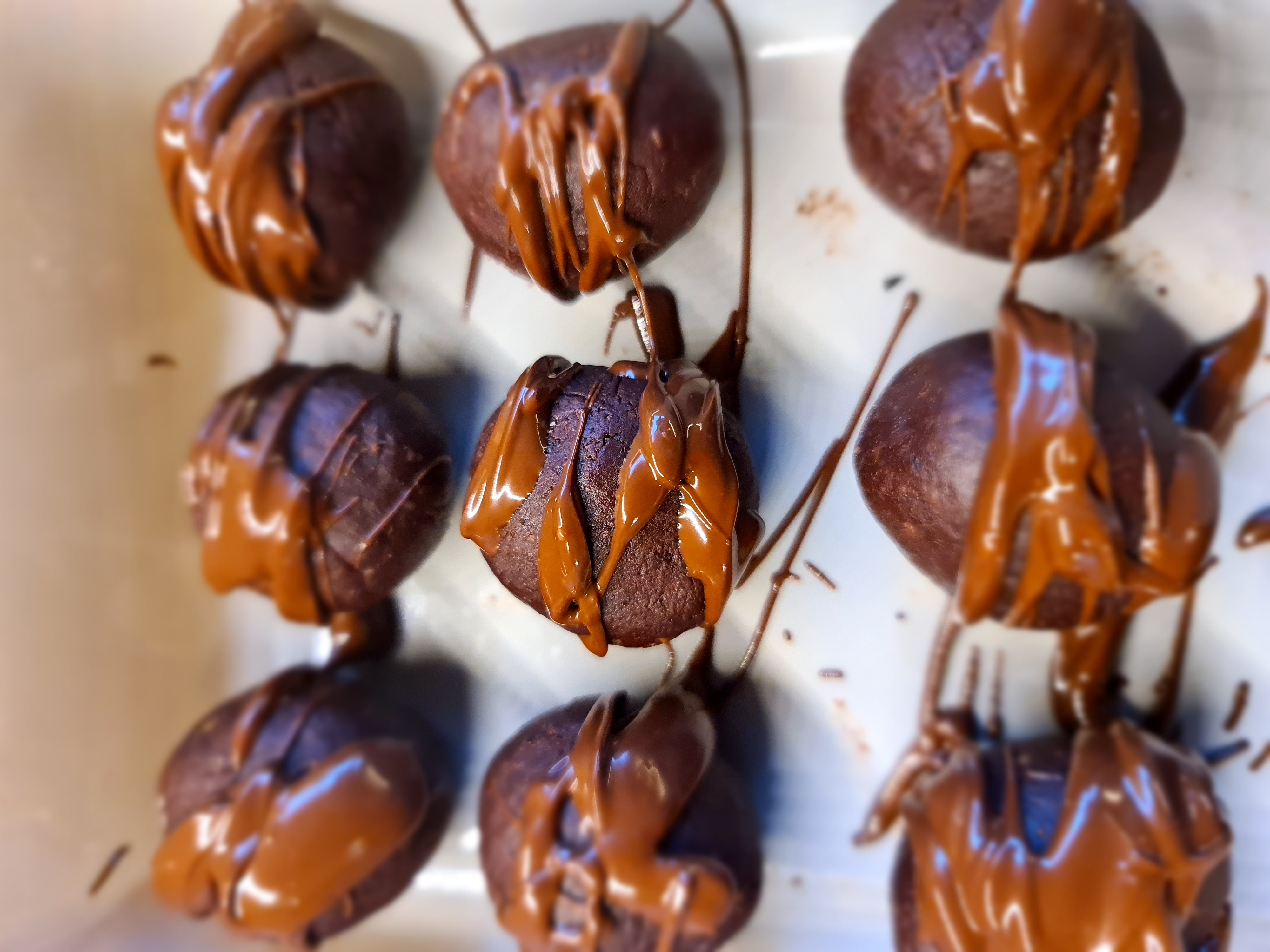 Þetta er nýja uppáhaldsnammið mitt. Finnst geggjað að fá mér eina trufflu eftir hádegismat. Nýtt trix sem ég er nýbúin að læra. Í staðinn fyrir að hjúpa hverja trufflu með súkkulaði bara raða þeim í bakka og sulla yfir þær með skeið, þá virka þær ansi hjúpaðar en súkkulaðimagnið verður 3var sinnum minna auk þess sem þetta er gífurlegur tímasparnaður.