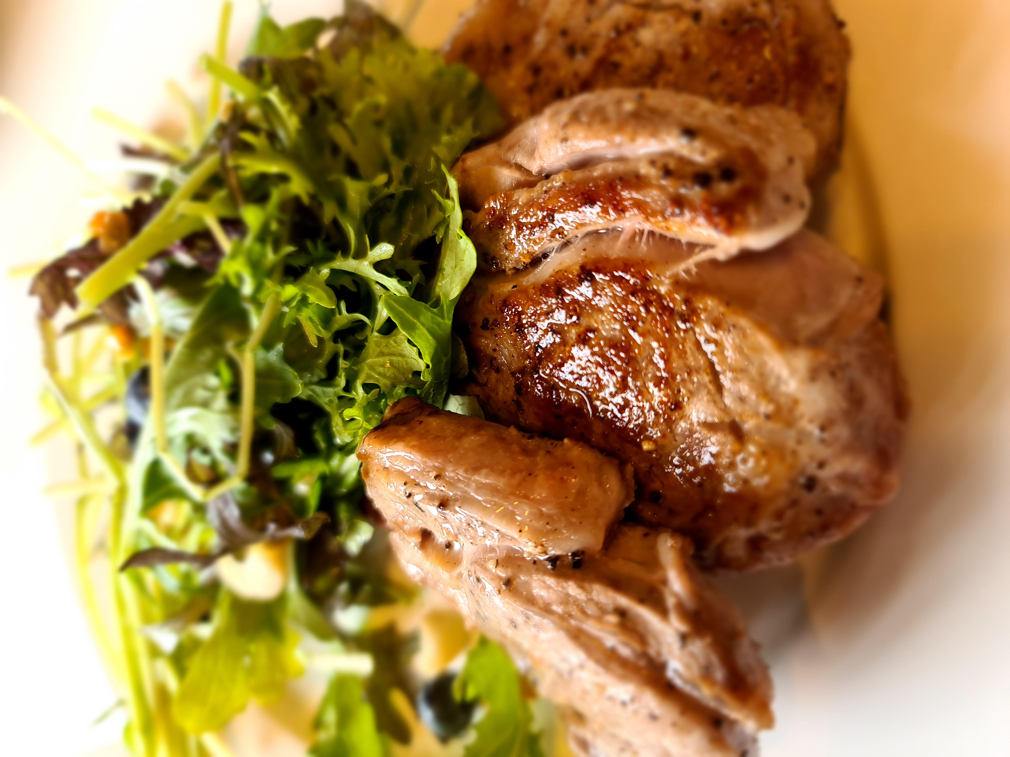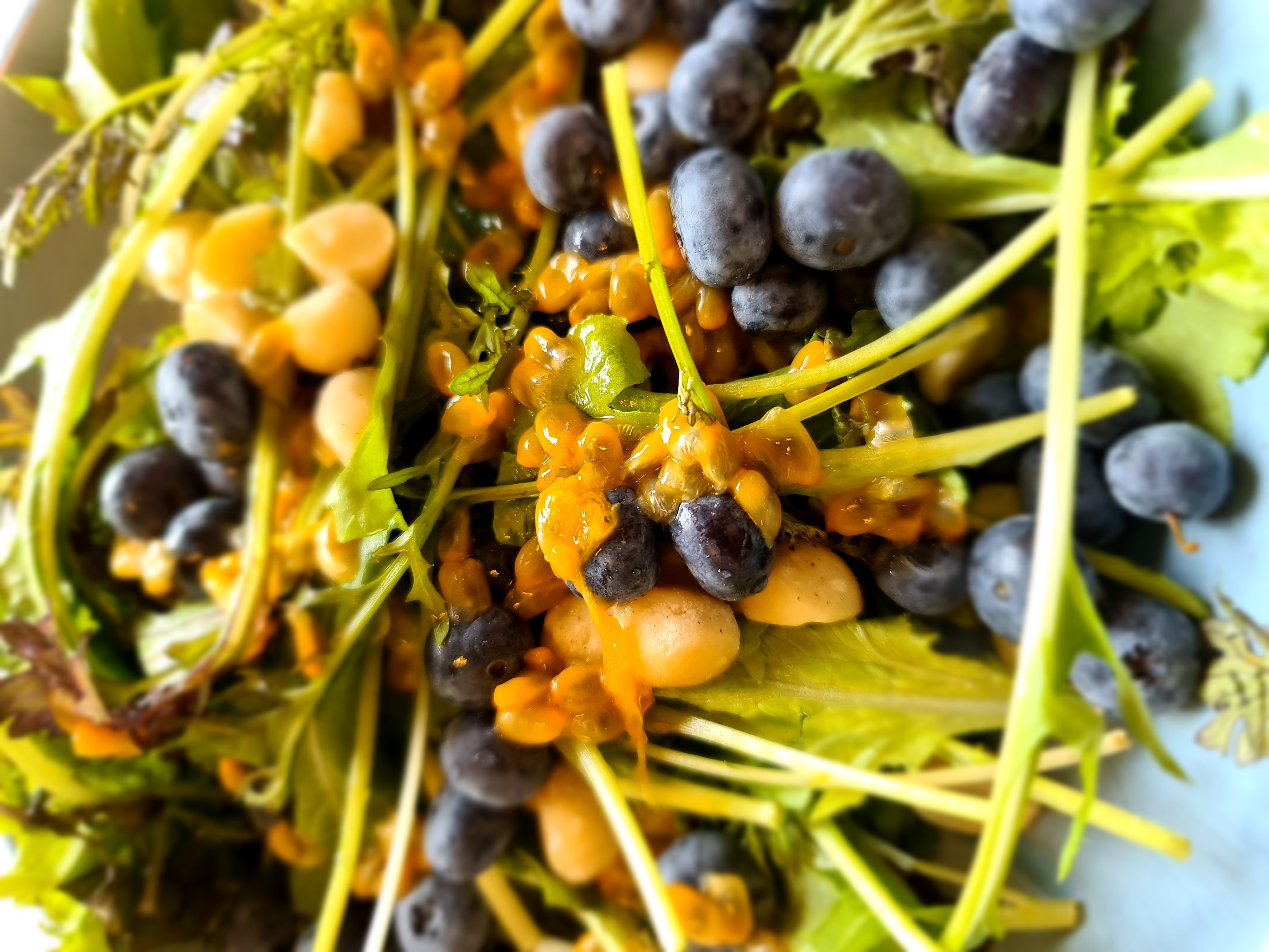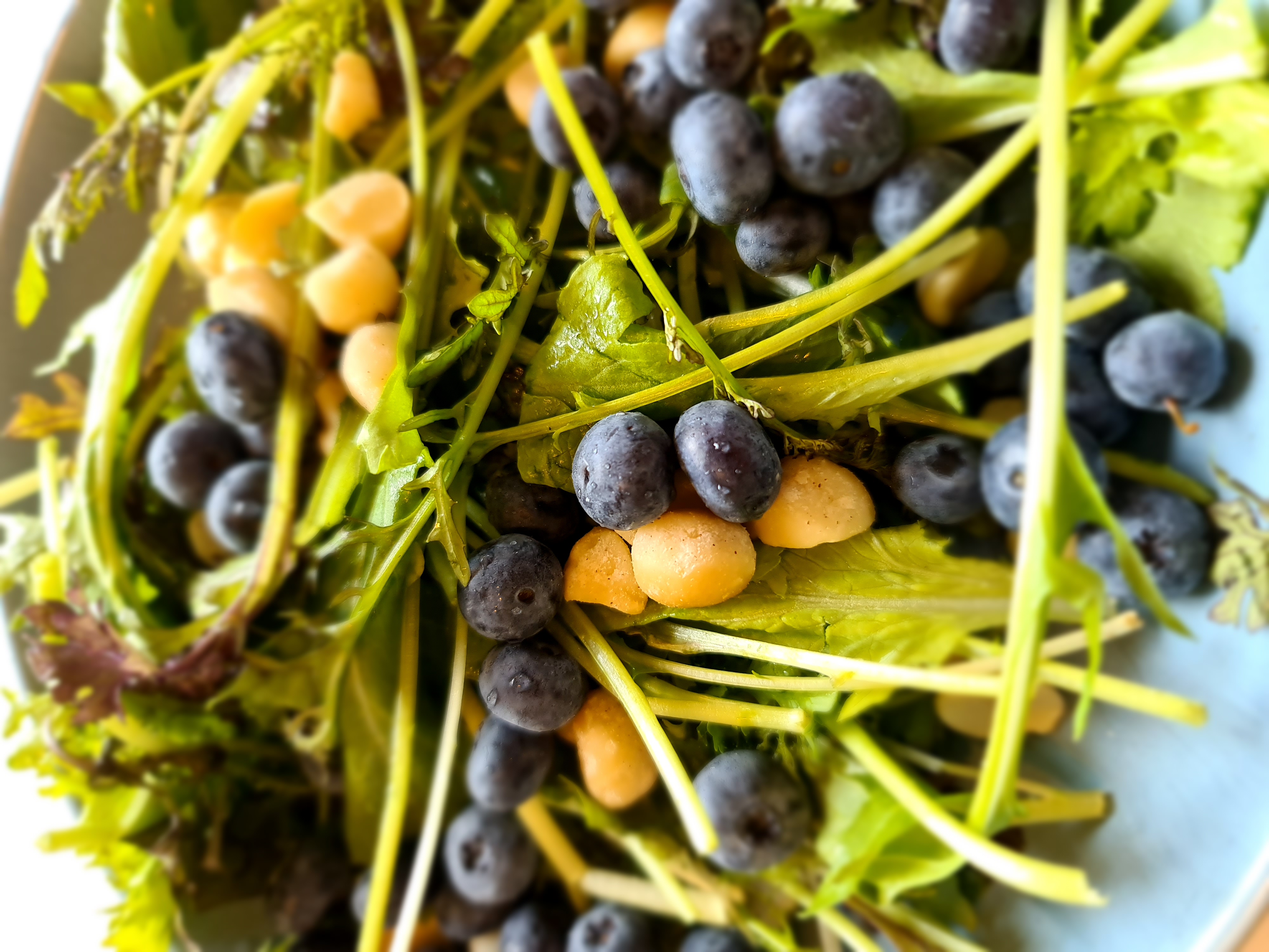 Borið fram með salati: Mitt uppáhald er salat, Macademiuhnetur frá Now og bláber, stundum set ég ástríðuávöxt eða granateplafræ yfir. Gott að setja góða Ólífuolíu yfir salatið.