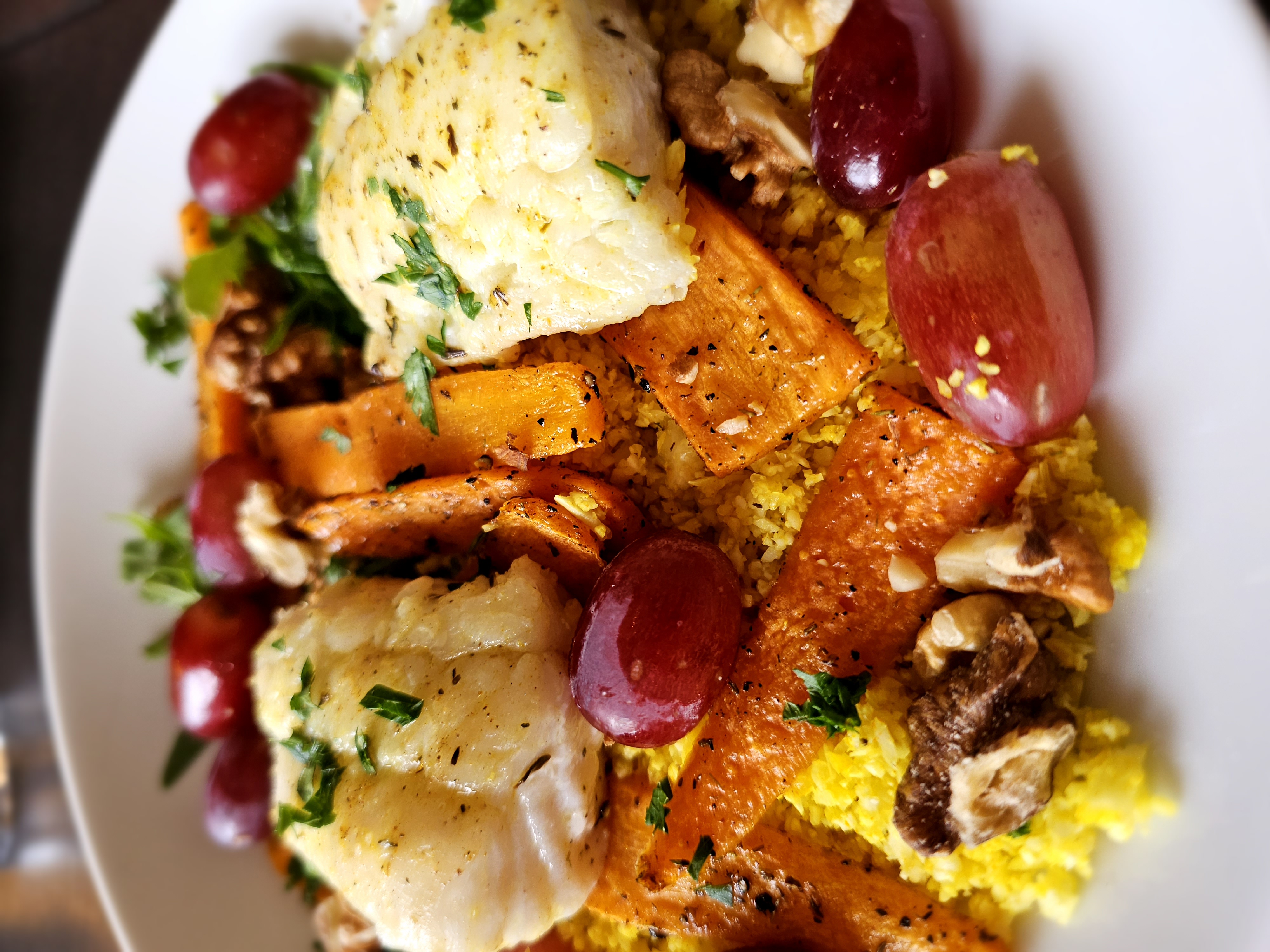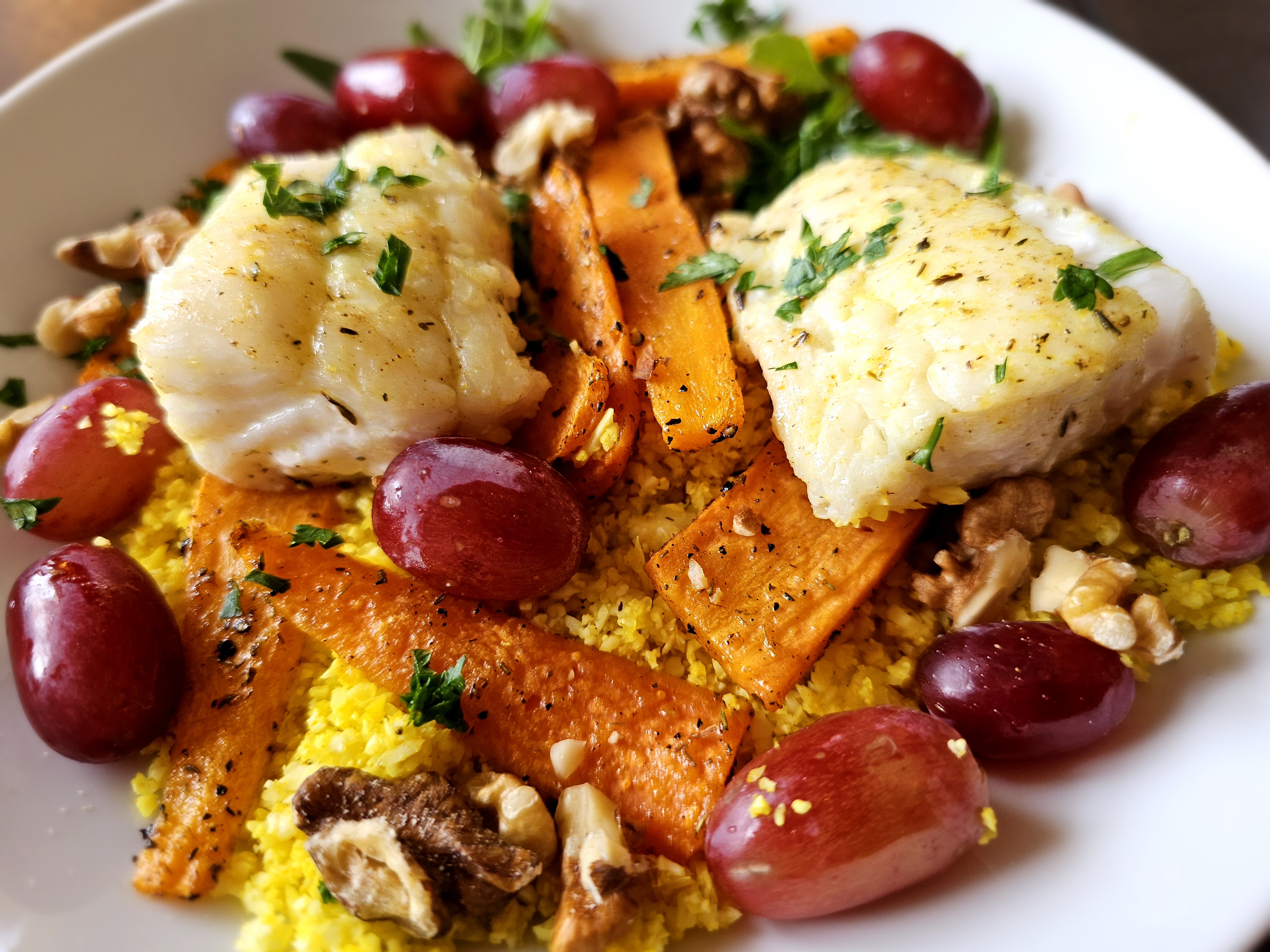 Maturinn er borinn fallega fram. Ég setti klettasalat í hluta á botninn og blómkálshrísgrjónin í restina. Nokkrar gulrætur ofan á hrísgrjónin og svo fiskinn. Aðeins fleiri gulrætur og svo vínber, valhnetur og skreytt með saxaðri steinstelju.