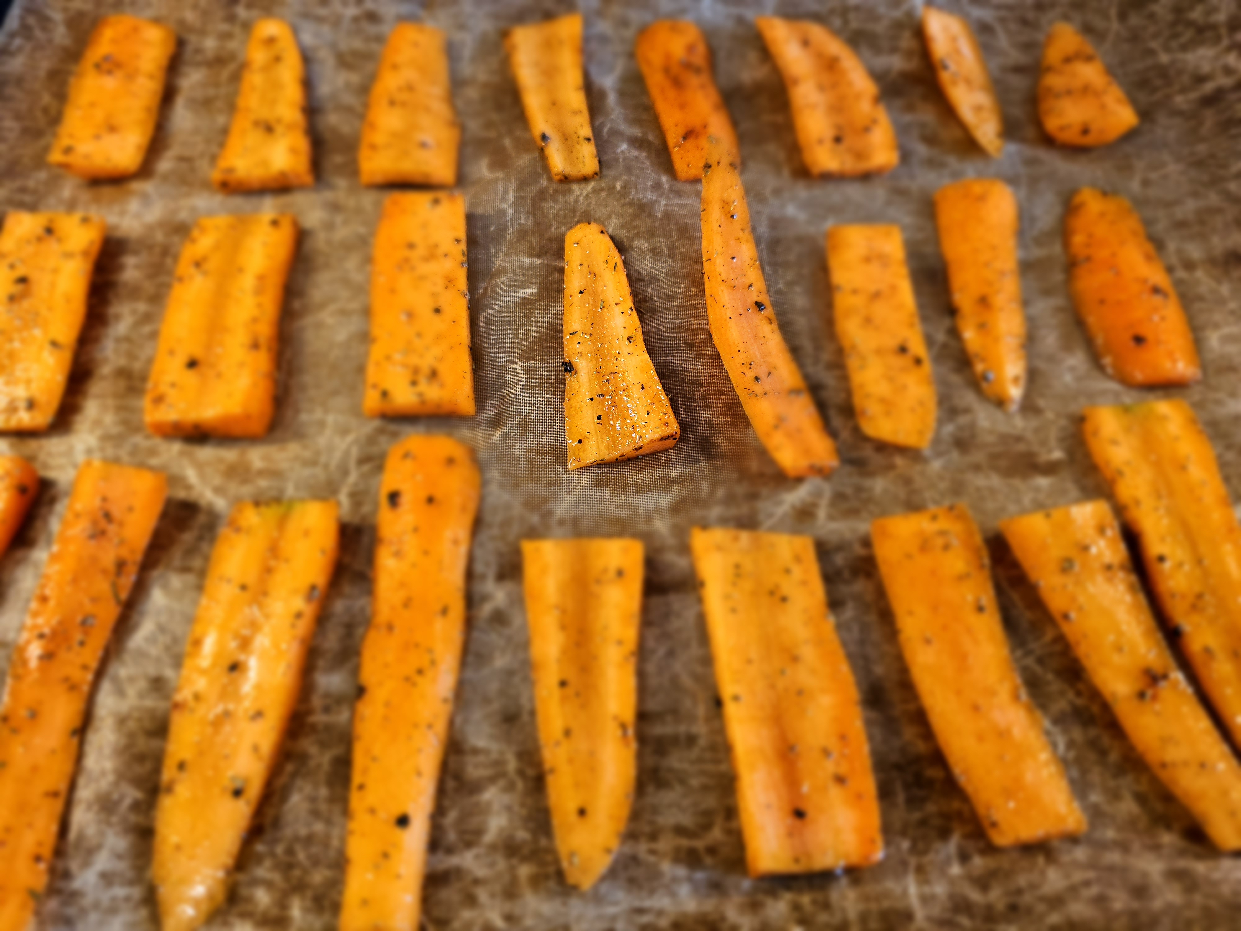 Gulræturnar eru skornar í mjóa fleka. Olía og krydd blandað saman í skál og gulrótum veltu upp úr. Raðað á bökunarplötu og bakaðar á sama tíma og langan í 10 mínútur.