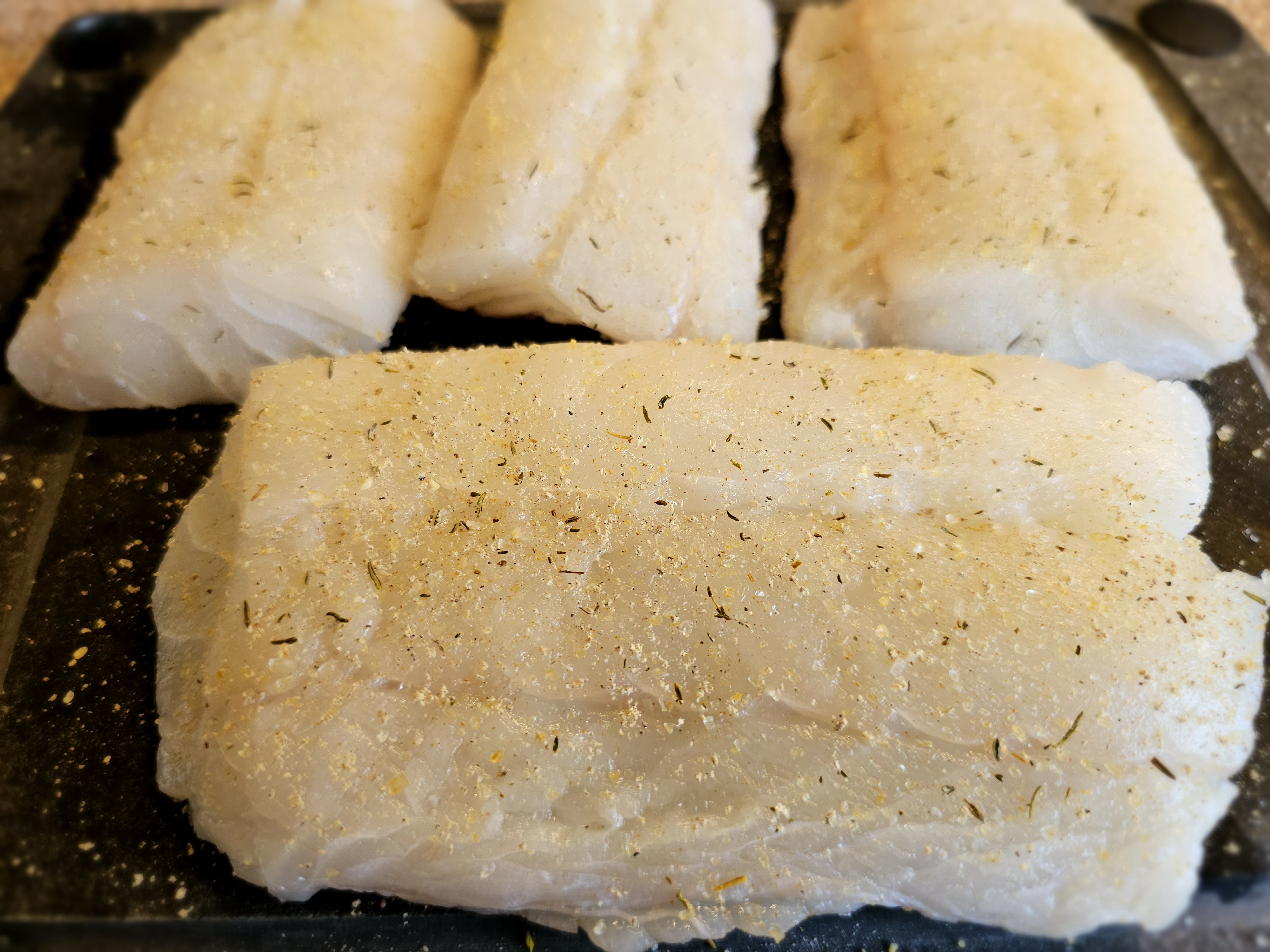 Langan er skorin í 4 bita og krydduð. Hún er léttsteikt á pönnu á annari hliðinni í ca 1 mínútu og svo snúið við og sett inn í ofn á sama tíma og gulræturnar.