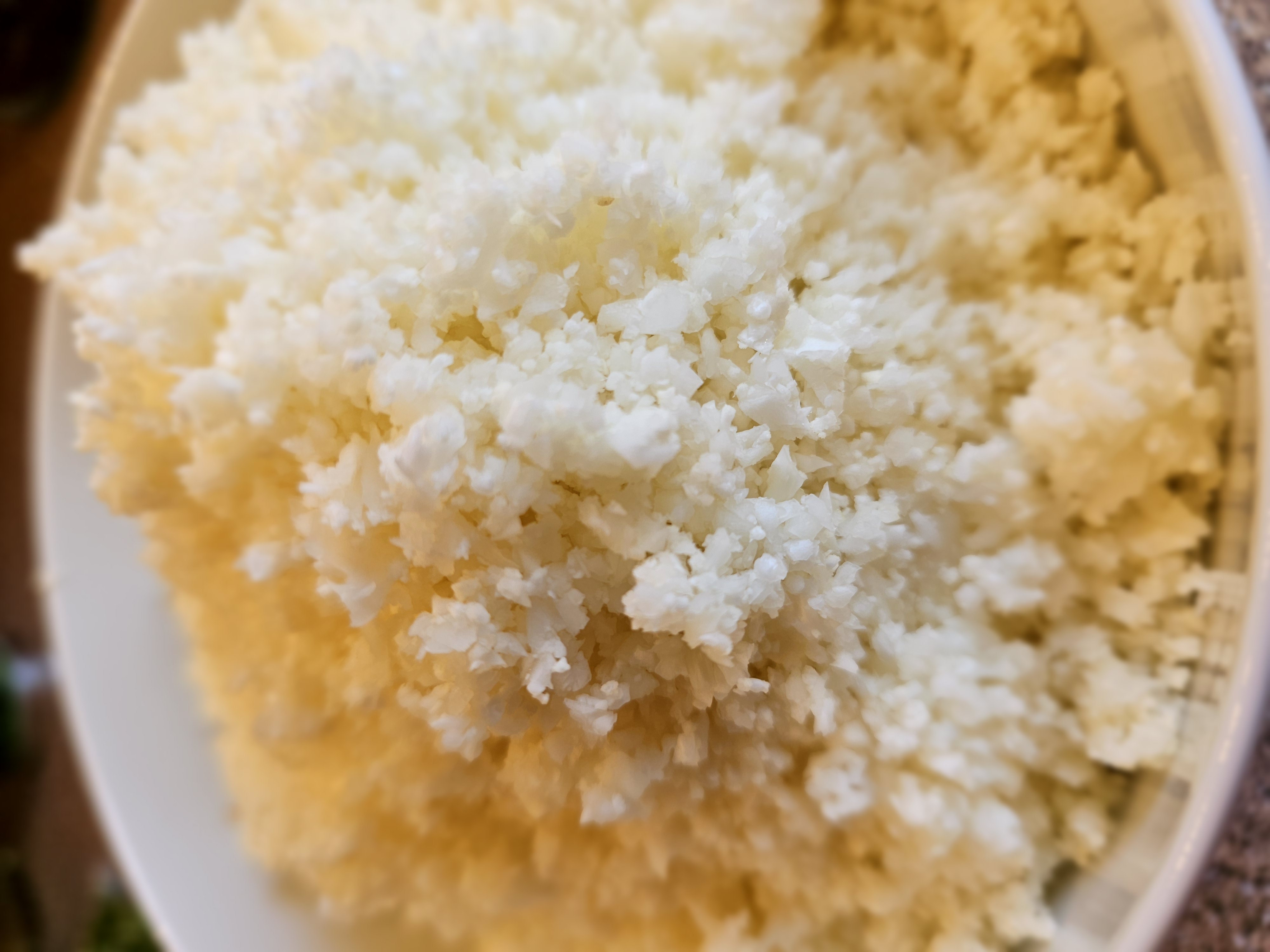 Blómkálið er tætt í matvinnsluvél (betra að púlsa nokkrum sinnum þannig að það tætist ekki of mikið). Kryddað vel og eldað á pönnu þar til að lítur út eins og hrísgrjón.