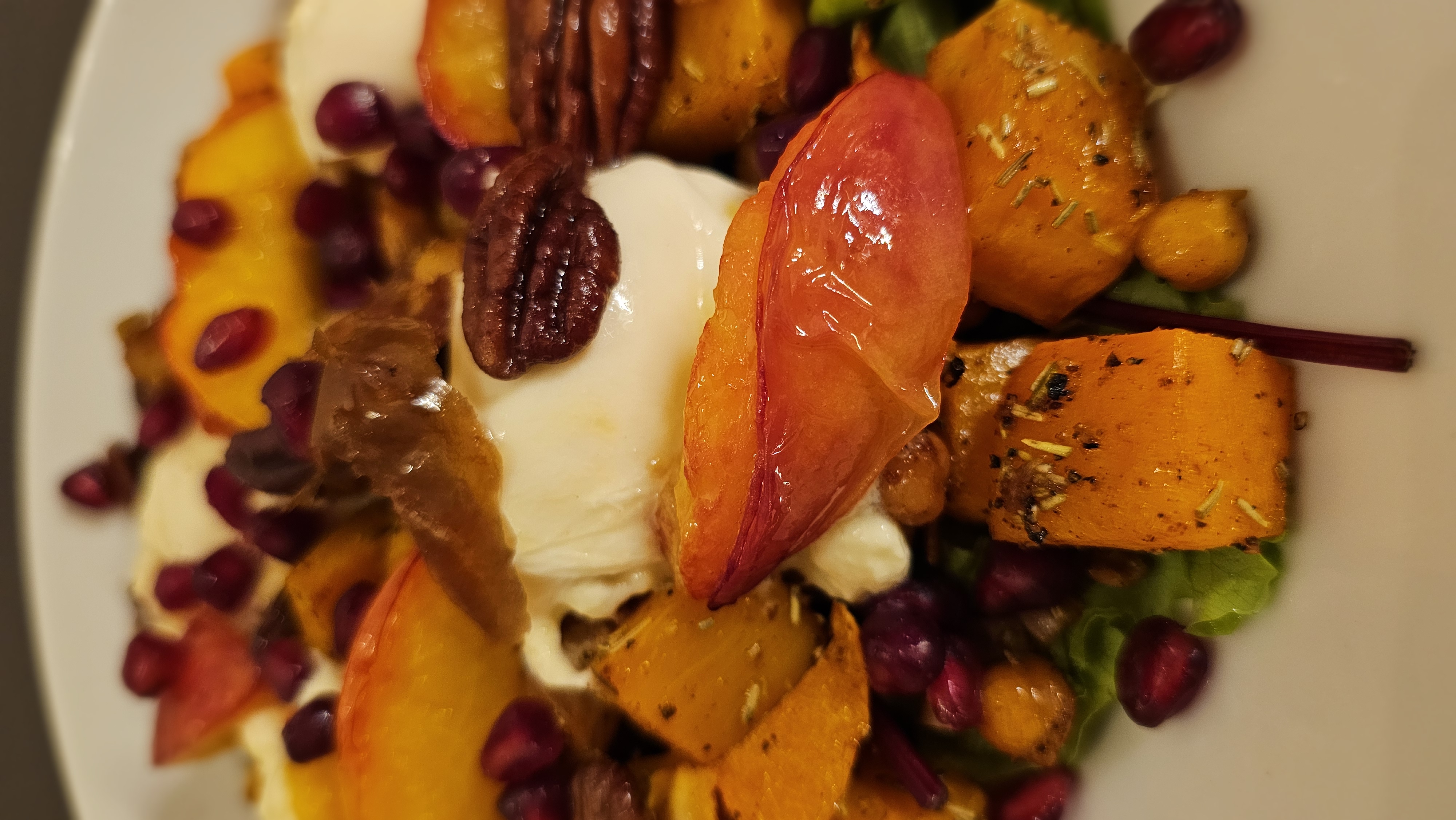 Þetta sló svo sannarlega í gegn. Lykilatriði er að bera þetta heitt fram. Einnig væri hægt að sleppa burrata og hafa þetta með einhverju próteini en það er hægt að leika sér helling með þetta salat. Ég prófaði að nota hita afgang af grunnsalatinu og skera niður epli og það var gífurlega gott líka. Mjög gott að hafa ristaðar pekanhnetur með þessu.
