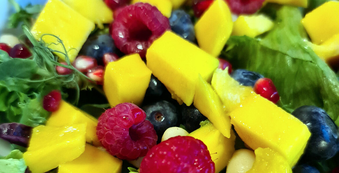 Þetta salat passar mjög vel með sterkum mat þar sem mangó mildar bragðið.