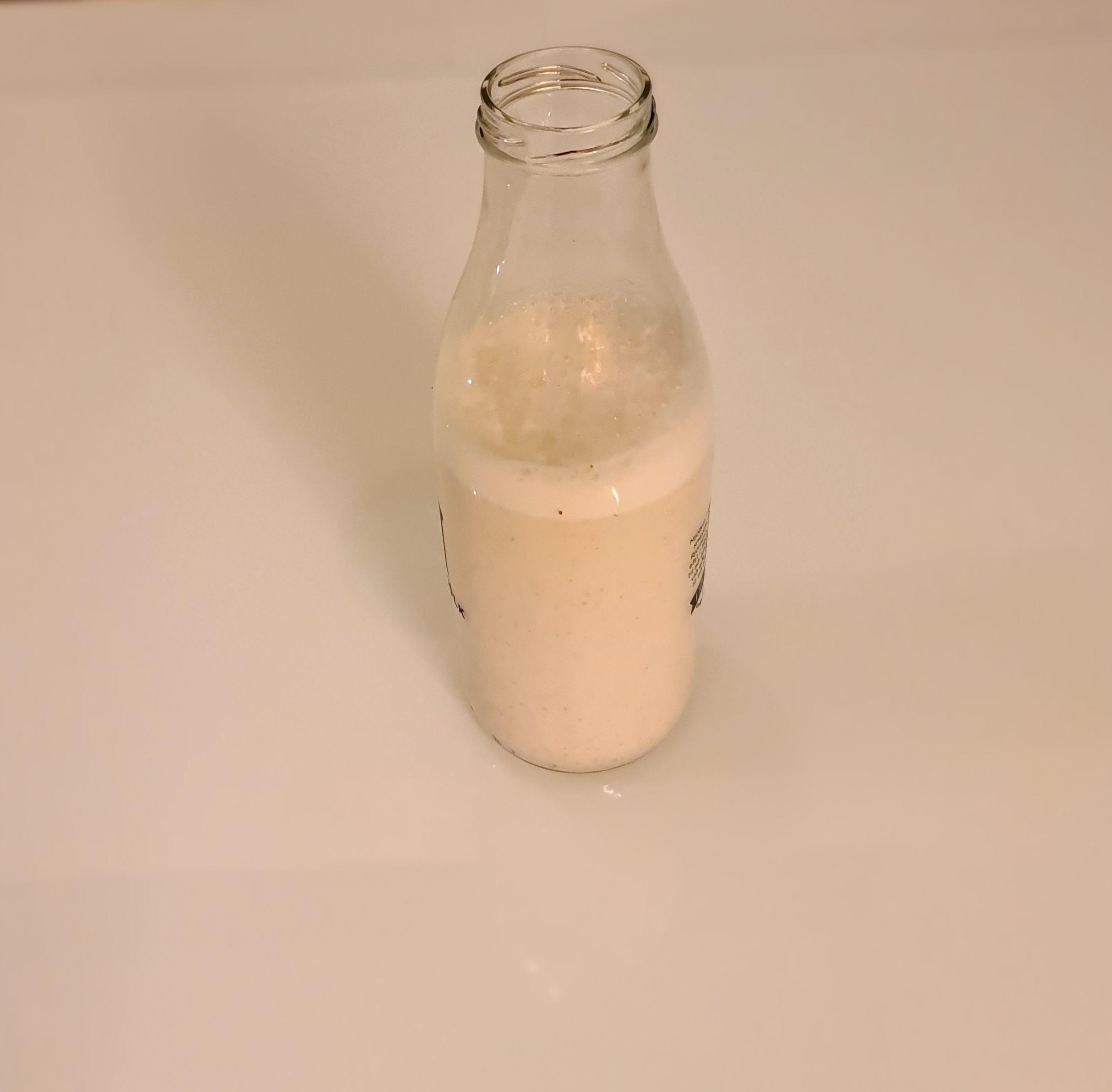 5. Helli mjólkinni í flösku og set hratið sem varð eftir í dall og nota í Epla Chiagrautinn minn, algjört nammi