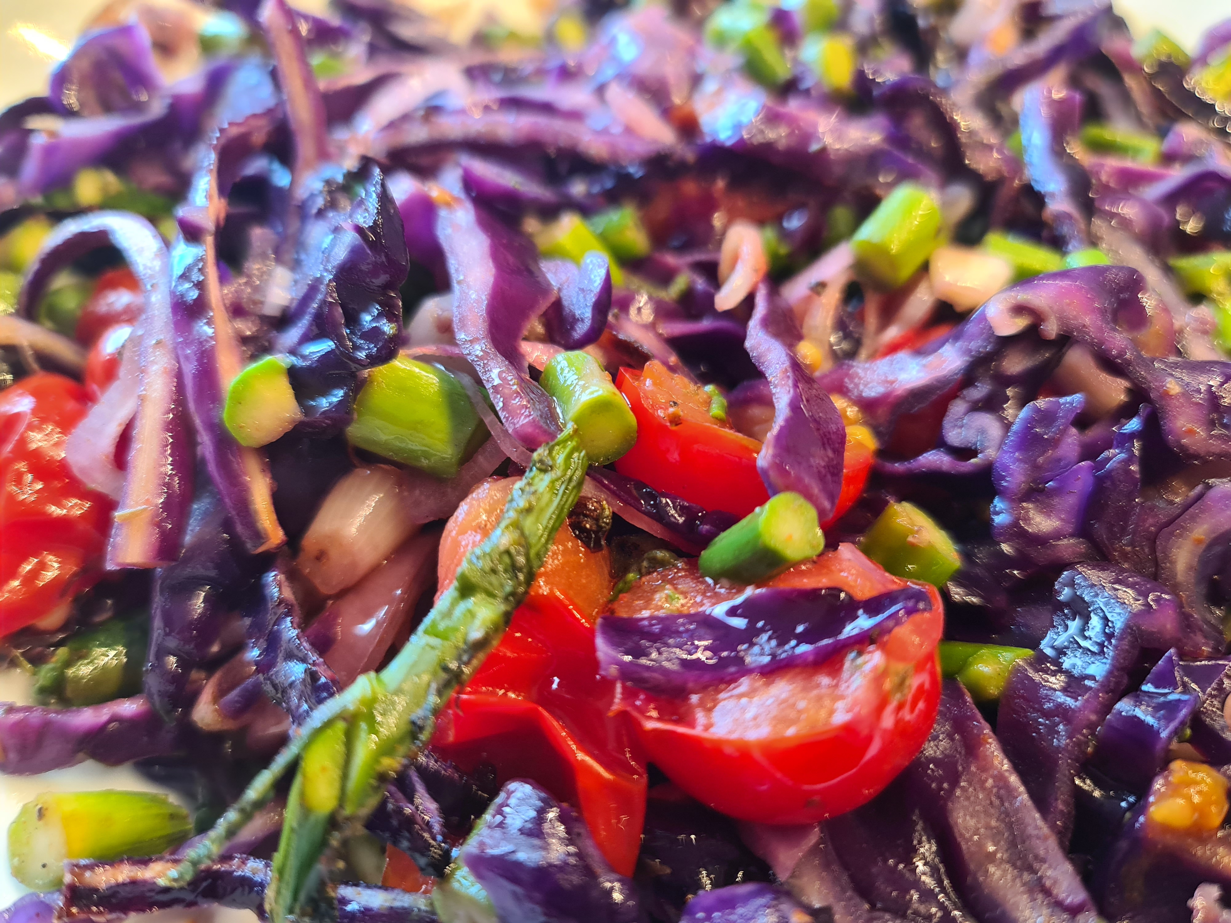 Ofninn er stilltur á 180 ¨C. Allt hráefnið sett á ofnplötu og sett yfir olía og kryddað. Bakað í 15 mínútur. Ef þú ert að elda bleikju eða kjöt með þá er tilvalið að smella ofnskúffunni neðst og setja svo kjöt/fisk í miðjuna. Svo fannst mér mjög gott að toppa þetta með smá mangó og það væri örugglega frábært að setja jarðarber, bláber og/eða granateplafræ