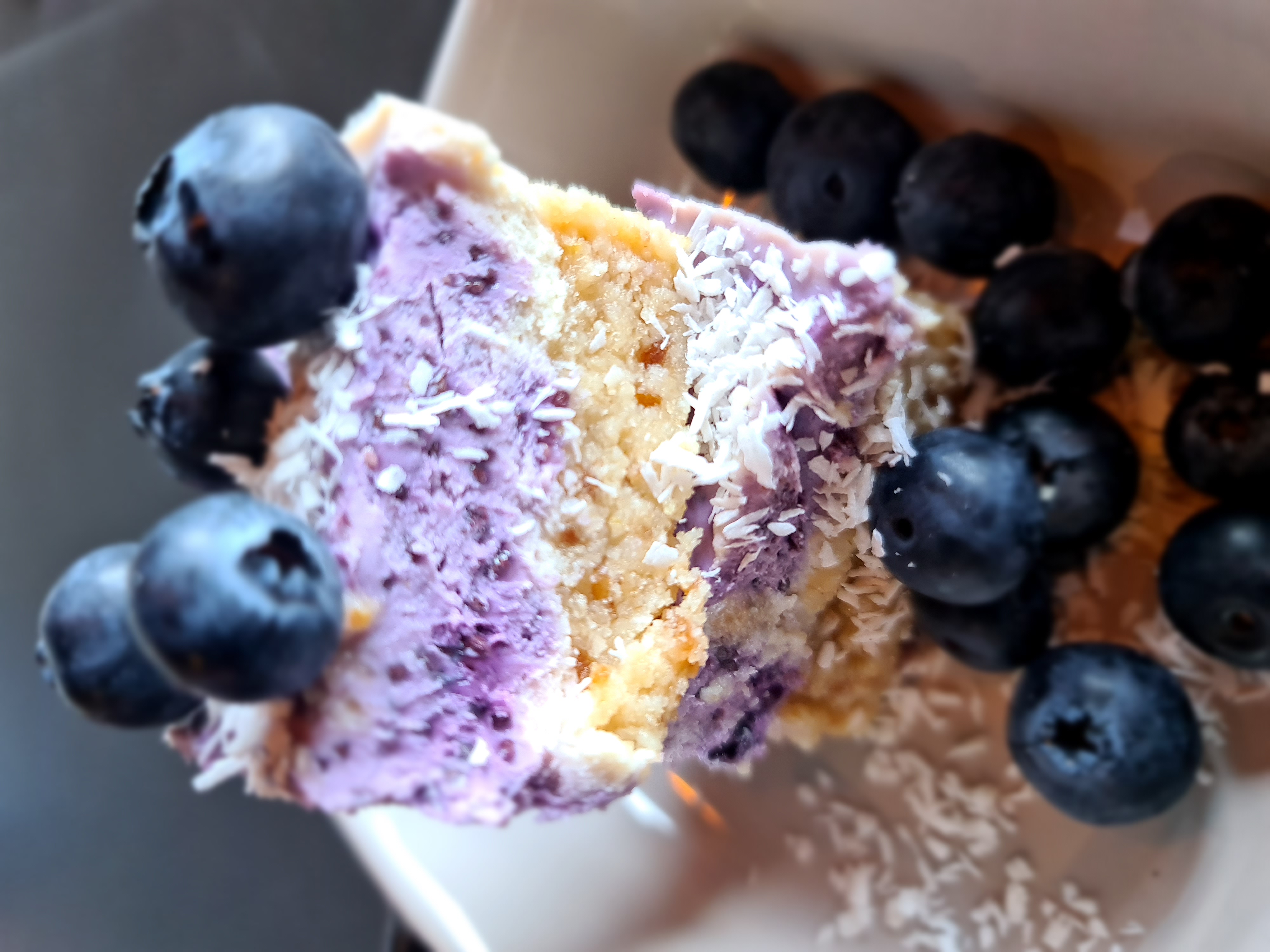 Fyllingin er sett ofan á botninn. Þá er bláberjamaukið sett ofan í doppum og hrært saman við fyllinguna. Sett inn í ísskáp í amk 2 tíma þar til fyllingin er orðin þétt eins og ostakaka. Upphaflega uppskriftin segir fryst í 4 tíma. Ég hef aldrei nennt því og það hefur ekki komið að sök. Mjög gott að gera fram með ferskum bláberjum.