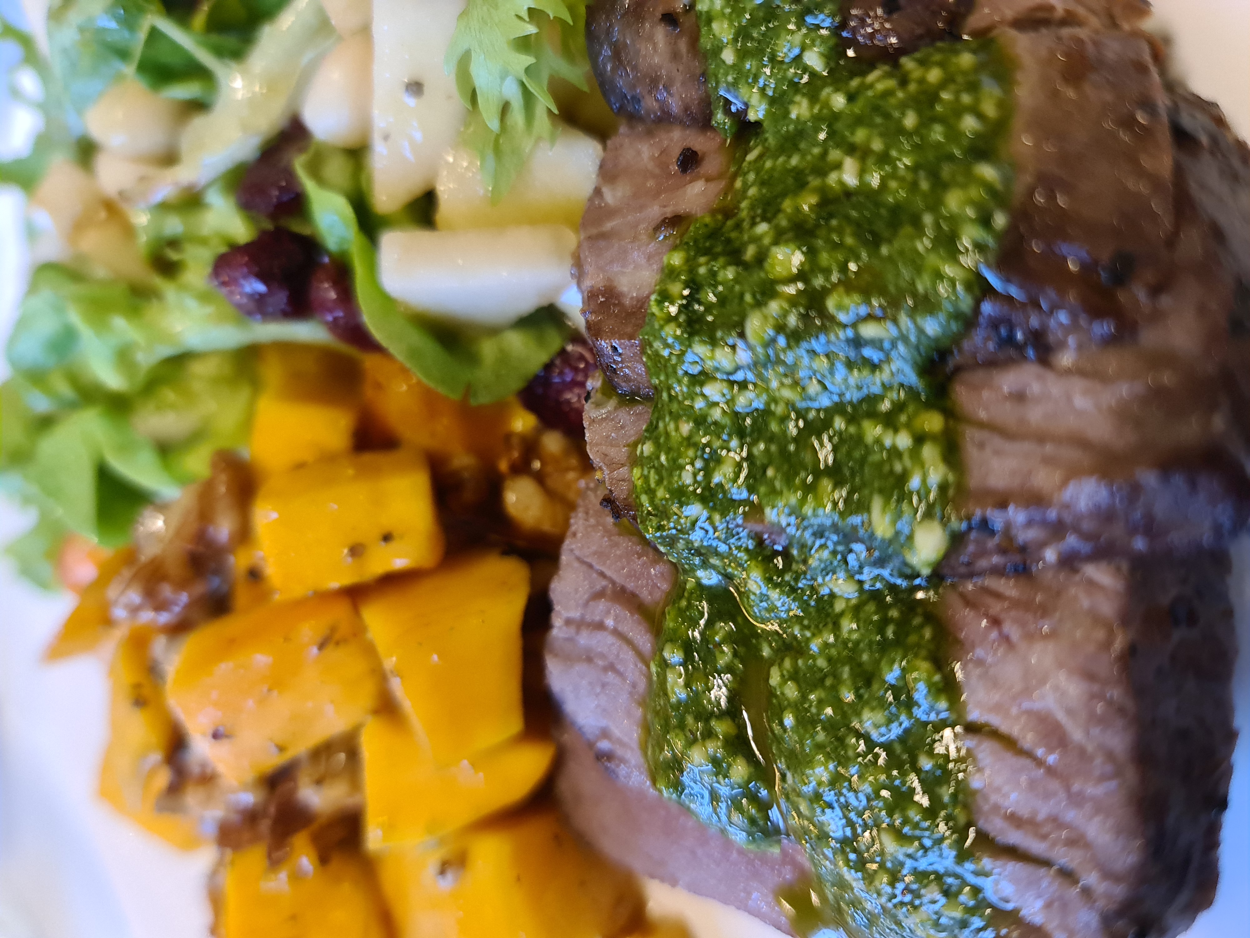 Mér finnst gífurlega gott að setja pestó yfir nautakjötið.